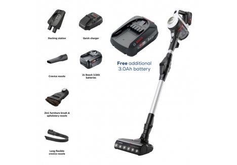 Bosch Cordless Vacuum Cleaner – 30-Minute Runtime Stick Vacuum White with Extra Battery – BCS612GBKIT