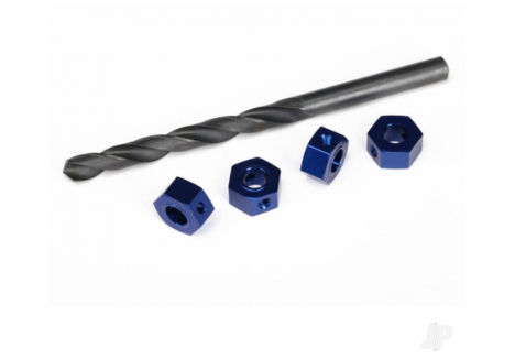 Traxxas Wheel adaptors, 12mm hex, 6061-T6 aluminium (Blue-anodised) (4 pcs) / screw pins (4 pcs) / drill bit, 0.25in (for 6mm shafts) (requires #6451 (x2), #6452 (x2), #6439, #6455, #5117 (x3)) TRX6869
