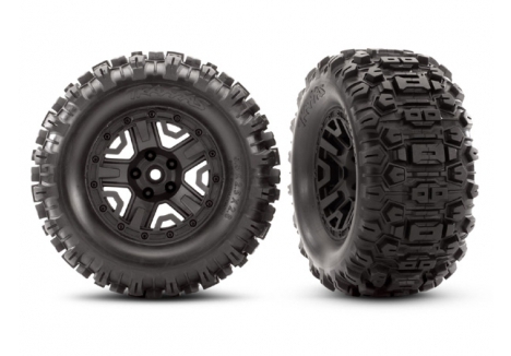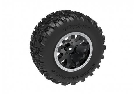 Traxxas Wheels & Tyres, Assembled (Black with Satin beadlock wheels, dual profile (2.1" outer, 2.6" inner), Sledgehammer tyres, foam inserts)) (rear) (2 pcs) TRX10770-STBLK