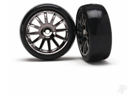 Traxxas Wheels & Tyres, assembled, glued (12-spoke Black Chrome wheels, slick tyres) (2) TRX7573A