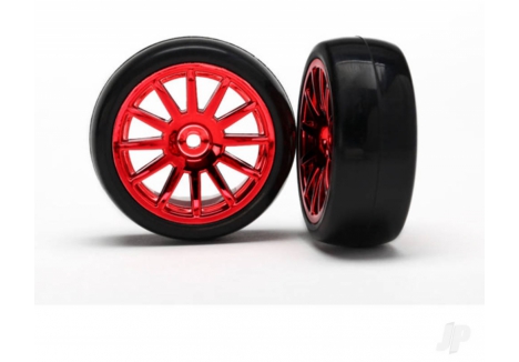 Traxxas Wheels & Tyres, assembled, glued (12-spoke Red Chrome wheels, slick tyres) (2) TRX7573X