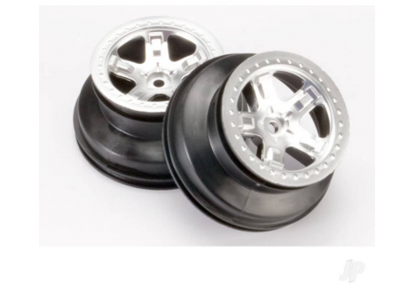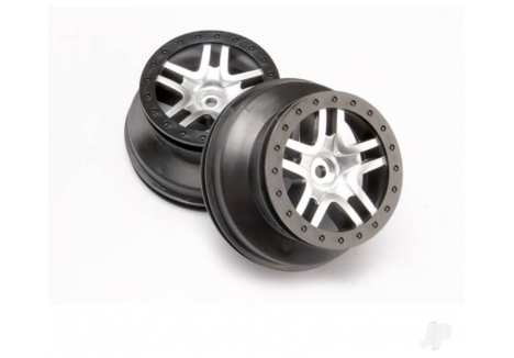 Traxxas Wheels, SCT Split-Spoke, satin chrome, black beadlock style, dual profile (2.2" outer 3.0" inner) (4WD front/rear, 2WD rear only) (2) TRX6872