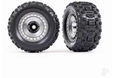 Traxxas Wheels & Tyres, Assembled, Glued (3.8in Satin Chrome wheels, Satin Chrome wheel covers, Sledgehammer tyres, foam inserts) (2 pcs) TRX9572X