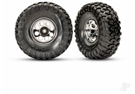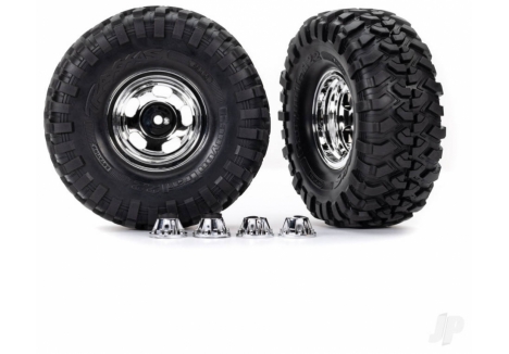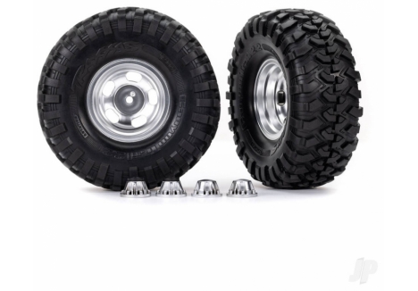 Traxxas Wheels & Tyres, Assembled, Glued (2.2in Satin Chrome wheels, Canyon Trail 5.3 x 2.2in Tyres) (2)/ centre caps (2) (requires #8255A extended thread stub axle) TRX8159