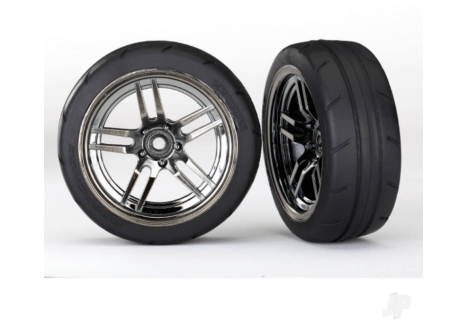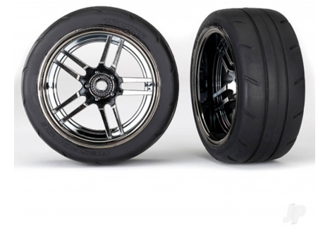 Traxxas Wheels & Tyres, Assembled (six spoke Graphite Grey wheels w/Chrome rim, 1.9" Drift tyres (2 dots, soft, smooth surfaces)) (wide, rear) (2) TRX10576