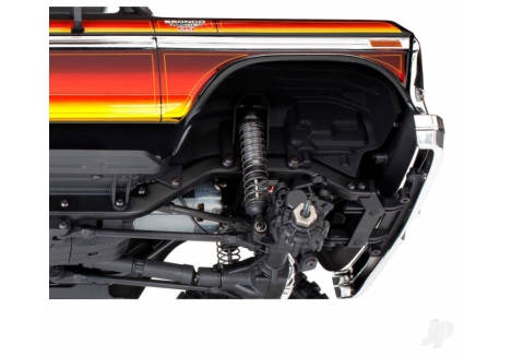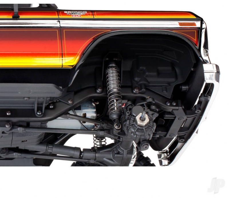 The Traxxas Ford Bronco TRX82046-4-RED with aluminium GTS shocks and steel ladder frame includes oil-filled coil-over shocks designed specifically for the TRX-4 chassis. These silver-anodised units feature threaded bodies for easy ride height adjustment and dual X-ring shaft seals for smooth damping. The shocks not only improve handling over rough terrain but also contribute to the model’s scale realism. Combined with the rigid steel ladder frame, the suspension system delivers precise articulation and consistent ground contact, even on uneven surfaces.