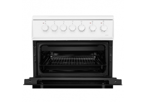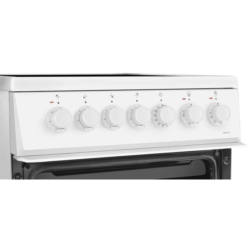 The main control panel of this ceramic hob cooker with separate grill is simple to use, with rotary dials for precise adjustment of oven and hob settings. A minute minder timer allows you to track cooking times easily. The hob-on indicator and residual heat indicators provide added safety, while a removable inner door glass makes cleaning hassle-free. All these features make the beko edvc503w ceramic hob double oven cooker an ideal choice for homes seeking performance, convenience and safety in one compact unit.