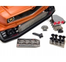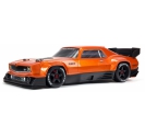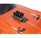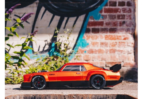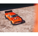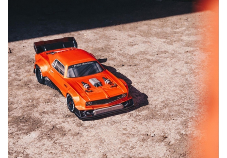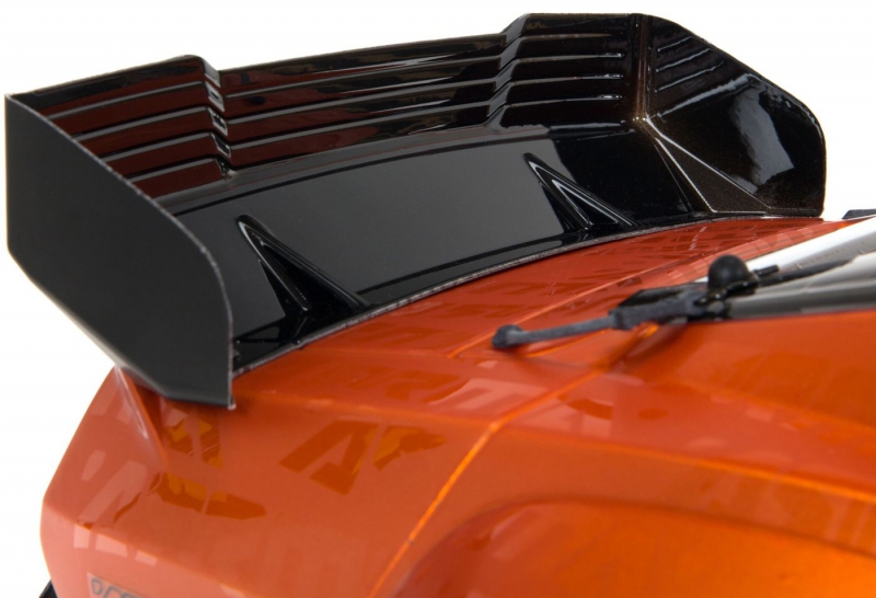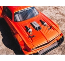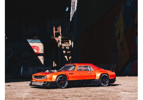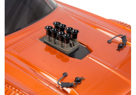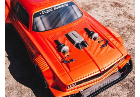 The multi-part undercut body of the ARRMA C-ARA7617V2T2 brushless muscle car arrives factory-finished in orange with screen-printed decals and trim. It includes interchangeable engine intake and cooling accessories, allowing drivers to personalize the look. Adjustable front and rear body mounts support tuning for stance and clearance, while the rear wing offers aerodynamic adjustability for drag racing or street bashing. The front splitter adds downforce, and the rear diffuser includes exhaust detailing for scale realism. These features make the ARRMA C-ARA7617V2T2 4WD resto-mod vehicle as visually striking as it is performance-driven.