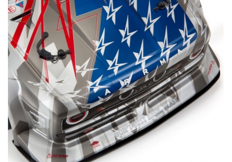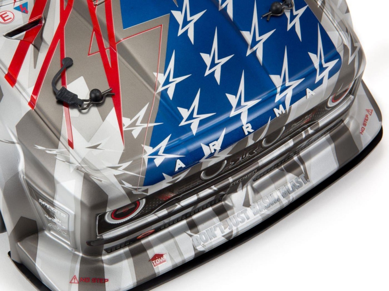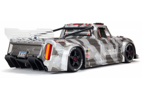 The silver matte gloss body of the ARRMA C-ARA7615V2T2 brushless street bash truck arrives factory-finished with screen-printed decals and trim. It includes adjustable front and rear body mounts, a tunable rear wing, full-width front splitter, and rear diffuser for aerodynamic control. These components balance downforce and grip, enabling faster cornering and improved stability. Combined with the mechanical handbrake and Smart telemetry system, the ARRMA C-ARA7615V2T2 1/7 scale all-road RC car offers a fully customizable driving experience.