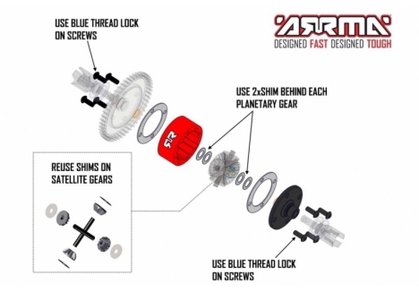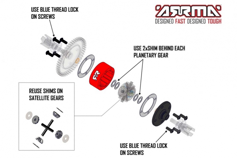 - Supported Differential Sets: AR220029 Centre Diff Set 50T, AR220041 Front/Rear Diff Set 43T Spiral, AR220028 Front/Rear Diff Set 43T Straight