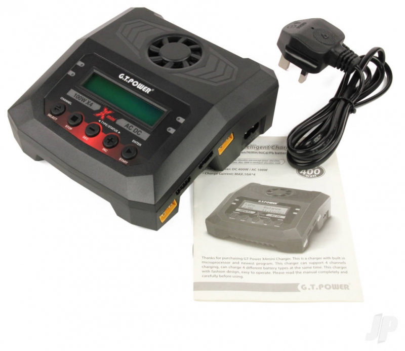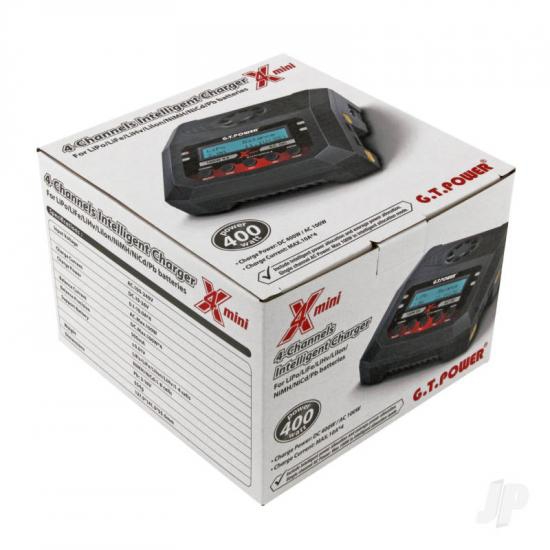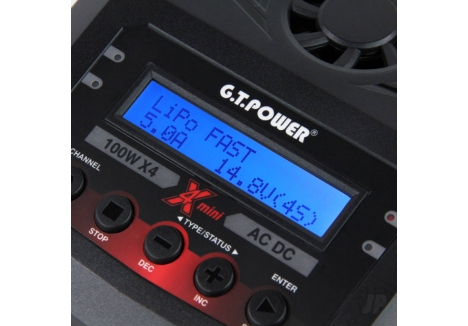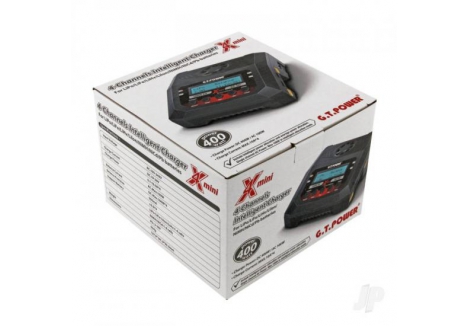 Charger manufacturers come and charger manufacturers go, however G.T. Power, it seems, is here to stay. Widely regarded as providing the best quality battery charging and care devices available in the RC world its products have made many friends over the years and, indeed, the X4 Mini is already following the trend. Offering an impressive 400W of charge power split between four independent 100W channels, the X4 is able to charge batteries with a much higher amperage in far less time. And, of course, with four outputs, up to four batteries can be charged at the same time, using completely separate charge routines. With a choice of mains or 19-26V DC input, the X4 is ideal for use at home or at the field. Moreover the backlit LCD makes it simple to select the charge parameters while also monitoring a battery's status in any light. Compatible with today's latest cell technologies this tidy unit is not only powerful and compact but convenient and versatile too, allowing it to travel with you to satisfy any number of multi-chemistry charging tasks.