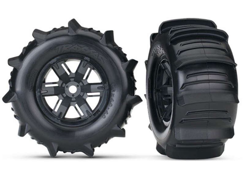 X-Maxx paddle tyres offer unbeatable traction in sand, snow, mud, or any loose surface. Paddle tyres feature outrageously strong scoops combined with strengthening ribs and TSM-rated glue joints to provide a whole new dimension in traction and off road fun. Paddle tyres come mounted and pre-glued with foam inserts on tough black six-spoke wheels for no-hassle, out-of-the-box bolt-on traction.