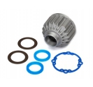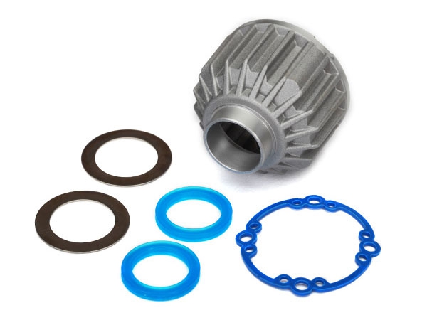 Aluminium differential carrier includes X-ring gaskets (2), ring gear gasket, and PTFE washers (2). Compatible with Torque-Biasing Centre Drive and front and rear differentials. Requires 7783X spider gear shaft.