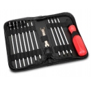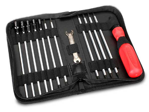 The Traxxas Tool Kit includes virtually every tool required to maintain Traxxas vehicles and stores them in a handy carrying case. A comfortable ratcheting handle allows the 11 included bits to telescope for those hard-to-reach screws. The kit includes nut drivers, hex drivers, standard and Phillips head screwdrivers and a wrench.