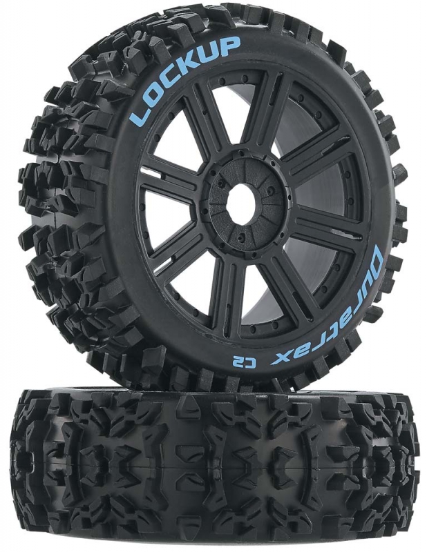 Deep knobby tread for high degree of traction Foam inserts ''Lockup'' and ''Duratrax C2'' printed on sidewall in blue Eight spoke wheels with 17mm hex