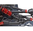 Our front lower A-arms have a triple beam style construction designed to spread impact energy across all three beams. Each beam’s cross-section is a whopping 5/8” (15.8mm) tall x 3/8” (9.5mm) wide. These massive beams reduce unwanted flex during normal suspension movement, yet allow impact-absorption during those not-so-perfect landings and crashes. We also moved the inner cross brace away from the chassis, eliminating the droop stop entirely. While this may seem counter-intuitive, our test truck’s chassis was bent at the droop stops, clearly illustrating that extreme impacts were too much for the chassis plate to handle. After all, there’s not much worse than a bent chassis.