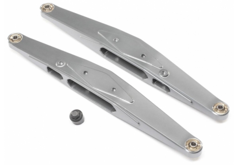 The Losi Super Baja Rey RC truck with long travel suspension and King coil-over shocks is engineered for aggressive off-road driving. The redesigned front suspension arms accommodate slider-style front driveshafts, allowing for increased travel and improved articulation. At the rear, the extended trailing arms and 4-link solid axle setup provide stability and control over uneven surfaces. The King coil-over oil filled shocks are tuned with new springs to absorb impacts and maintain traction, ensuring that the truck performs consistently across jumps, whoops, and rocky paths. This suspension system is built to take punishment and deliver performance.