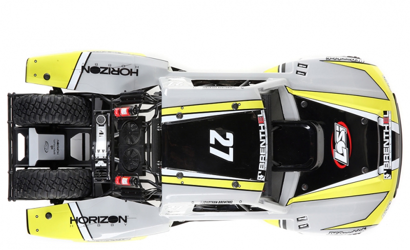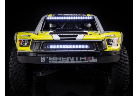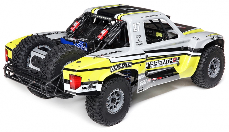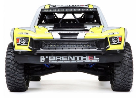 The Losi Super Baja Rey yellow desert truck with aluminium chassis and Brenthel body combines race-inspired aesthetics with structural strength. The one-piece painted Brenthel body replicates the look of full-scale trophy trucks, while the integrated composite roll cage adds rigidity and protection. The 4mm 6061-T6 aluminium chassis plate and upper deck provide a solid foundation for the drivetrain and suspension components. This combination of materials ensures that the truck can withstand impacts and maintain its shape under stress. The front bumper with realistic lower valance and Brenthel logo adds to the truck’s aggressive styling and authenticity.
