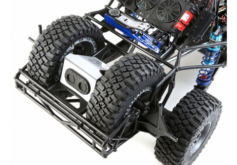The Losi Super Baja Rey desert truck with bottom-loading battery tray and dual spare tyres offers a unique battery access system that simplifies power management. Unlike conventional setups that require body removal, the bottom-loading tray allows users to swap batteries quickly and securely. This design reduces downtime and eliminates the hassle of dealing with battery straps or body clips. Combined with the dual spare tyres mounted on the rear cage, the truck maintains a balanced weight distribution while enhancing its scale appearance. These features make the Super Baja Rey both practical and visually striking.