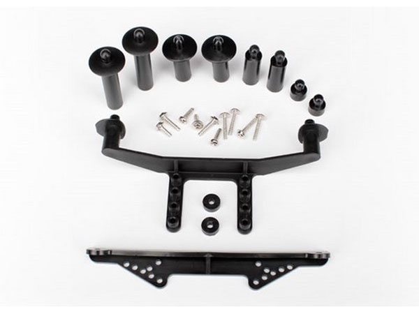 These are the Front and Rear Body Mounts for several specified Traxxas vehicles. Set includes body mounts for front and rear in black, body posts (52mm, 38mm, 25mm, and 6.5mm, 2-ea.), body post extensions, and hardware.