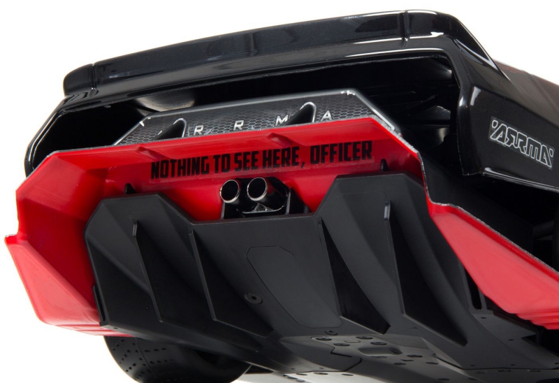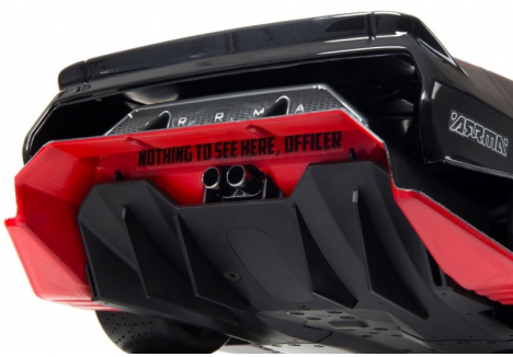 The ARRMA FELONY 6S BLX 1/7 Street Bash 4WD RTR, Black, blends scale realism with bashing strength. The multi-part body channels classic muscle car lines, while the undercut design and adjustable wing add functional downforce. Larger rear tyres emphasise traction and attitude, and ARRMA engineers match the front and rear gearbox ratios to those tyre sizes for balanced corner exit and straight-line stability. Beneath the shell, the 3mm 6061-T6 aluminium chassis and centre brace resist flex during high-speed runs and rapid direction changes, keeping geometry consistent so the suspension and tyres can do their work.