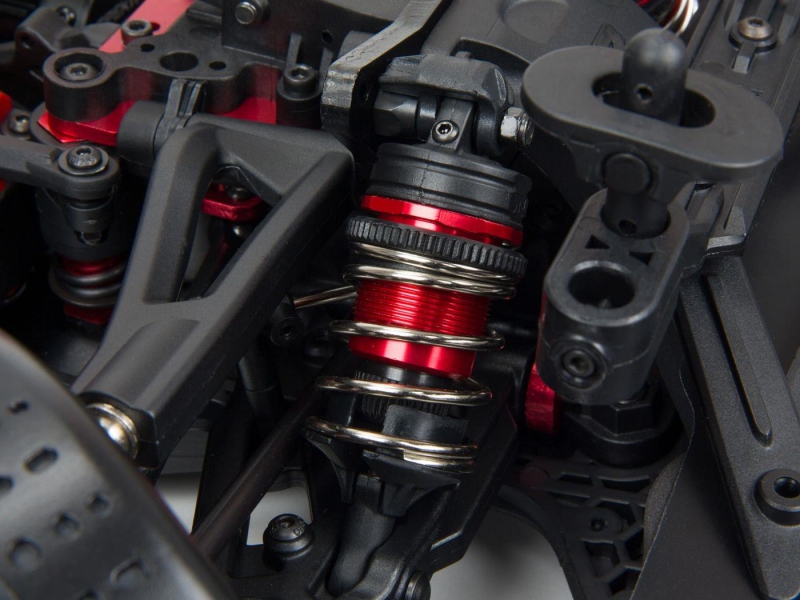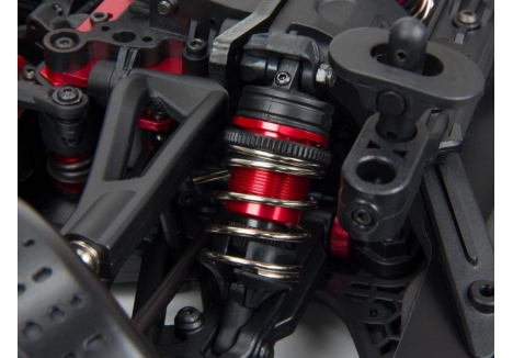 - Independent suspension with oil-filled, adjustable aluminium shocks (front 7.7 cm, rear 8.7 cm).