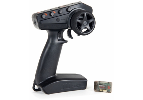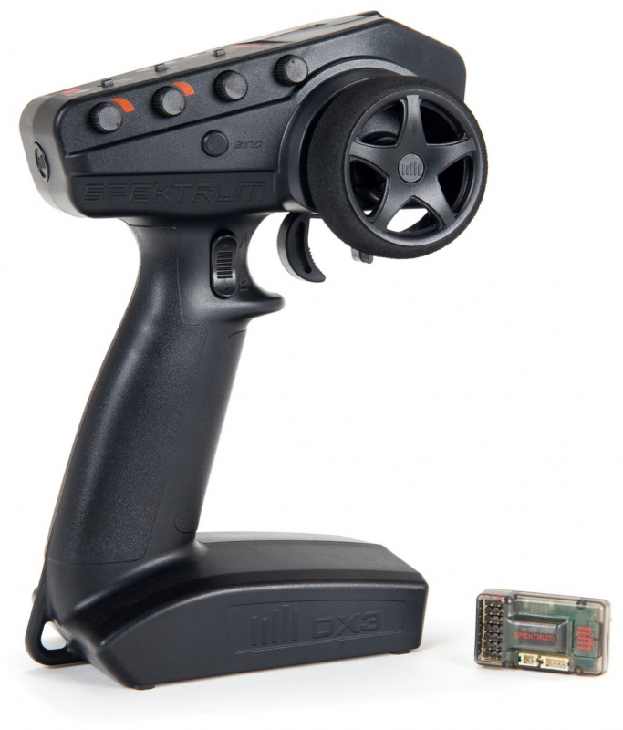 - Spektrum DX3 DSMR 2.4 GHz 3-channel transmitter with ergonomic design and AVC gain knob.