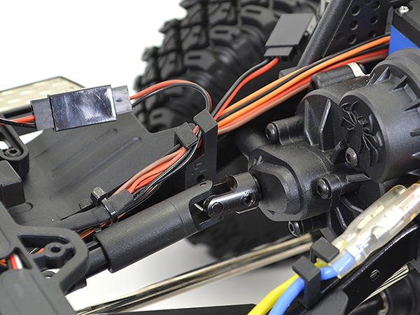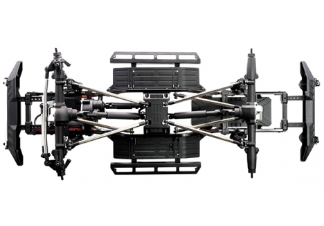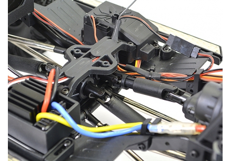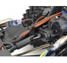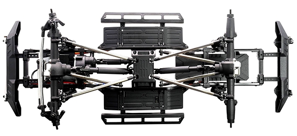 The split transmission layout provides a much lower centre section allowing for aftermarket interiors to be mounted for added scale realism. The moulded side chassis plates have aluminium plates on the exterior while the inner plates provide protection from the elements as well as mounting receiver and Hobbywing speed control. The moulded receiver box features additional plug in ports for LED lights and aftermarket winches.