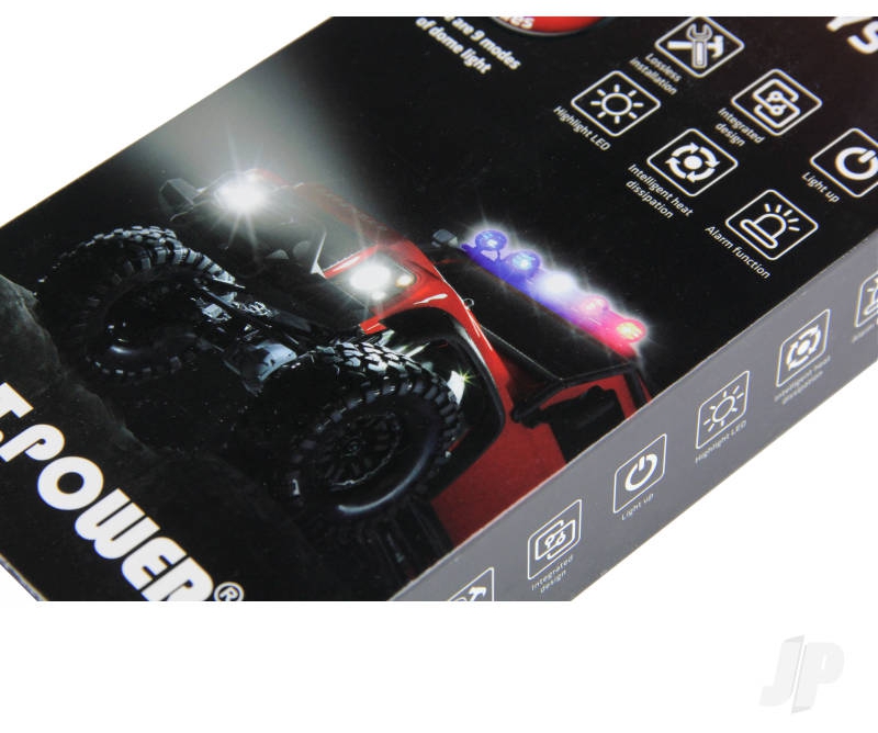 Specifically designed for the Traxxas Land Rover Defender this comprehensive light system is just what you need to bring your favourite off-roader to life. Offering switchable headlights and tail lights along with fog lights and indicators this authentic set also features a set of five roof lights with nine operating modes and flashing sequences for the red (x2) white (x1) and blue (x2) lights.