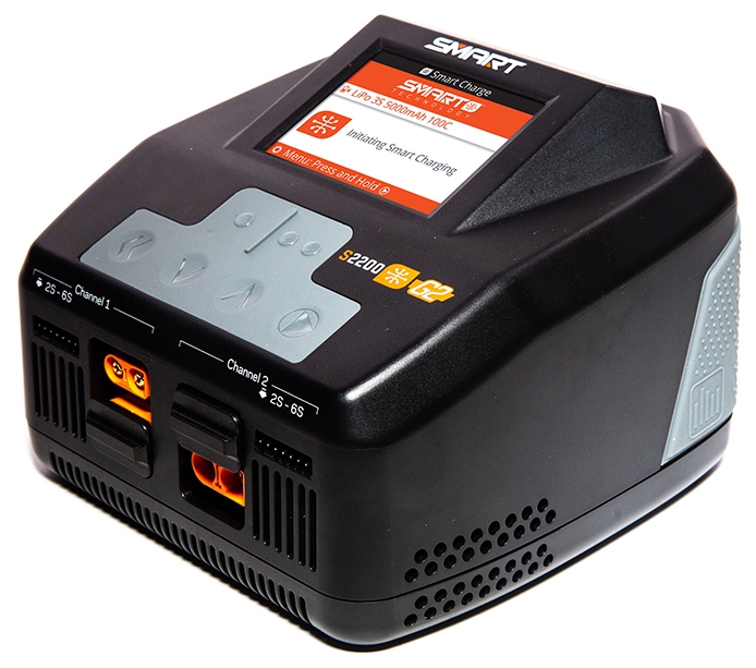 With 2 channels and up to 200W per channel, the Spektrum S2200 Smart G2 AC Charger offers fast, easy charging, especially for modelers using Smart batteries - with Auto Charge simplicity, one-connection balancing, IC3 or IC5 output ports, and more.