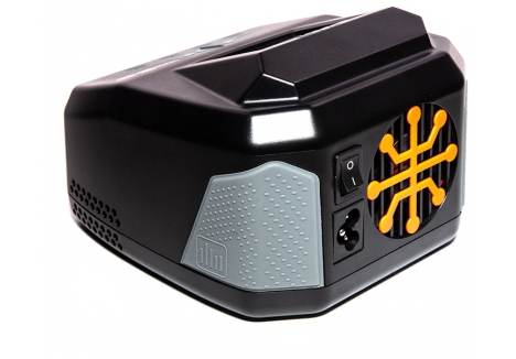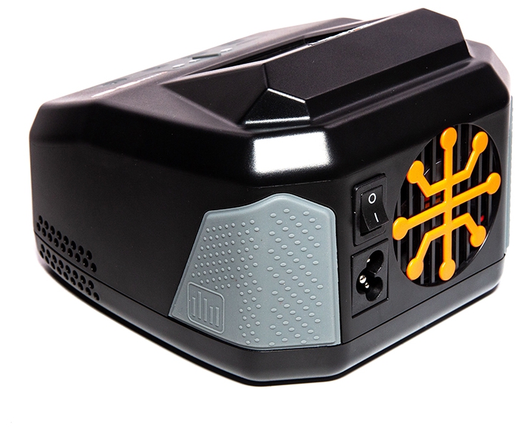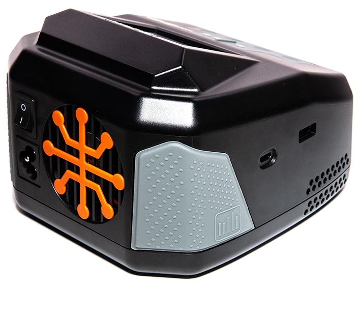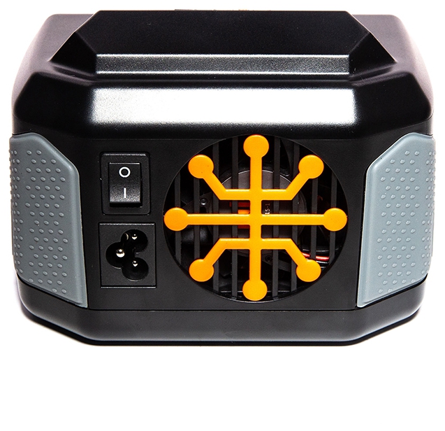The charger's sleek case fits perfectly on your workbench and in your pit or field bag. Its power cord is detachable for easy transport. Rubber grips help you hold the charger securely while connecting and removing batteries. USB input and output ports enable you to update charger firmware and to charge secondary devices. Other features include a built-in ON/OFF power switch and low-noise cooling fan.