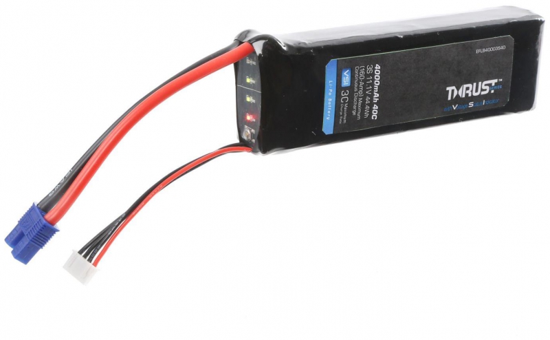 E-flite® Thrust® VSI (Voltage Status Indicator) Series lithium polymer batteries feature an integrated voltage checker so you can check the status of your battery on the go. A series of LED lights will indicate the state of charge at the press of a button. Compact E-flite® Thrust Series lithium polymer batteries are rated at 40C to deliver excellent power and longevity without a major size or weight penalty. Each battery is equipped with popular EC3T (EFLB50006S40 is equipped with an EC5) and JST-XH balance connectors compatible with a wide range of chargers (such as those from Dynamite and Orion®) and ESCs, and they're available in a variety of capacities and cell counts for use in park flyers up to large airplanes, helis and drones.