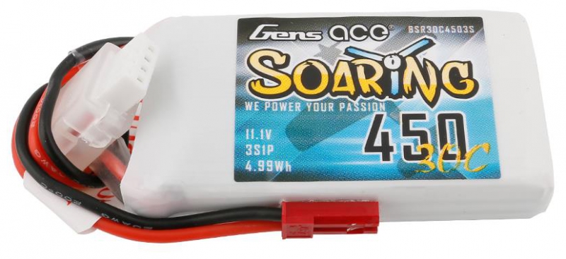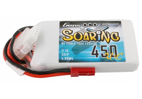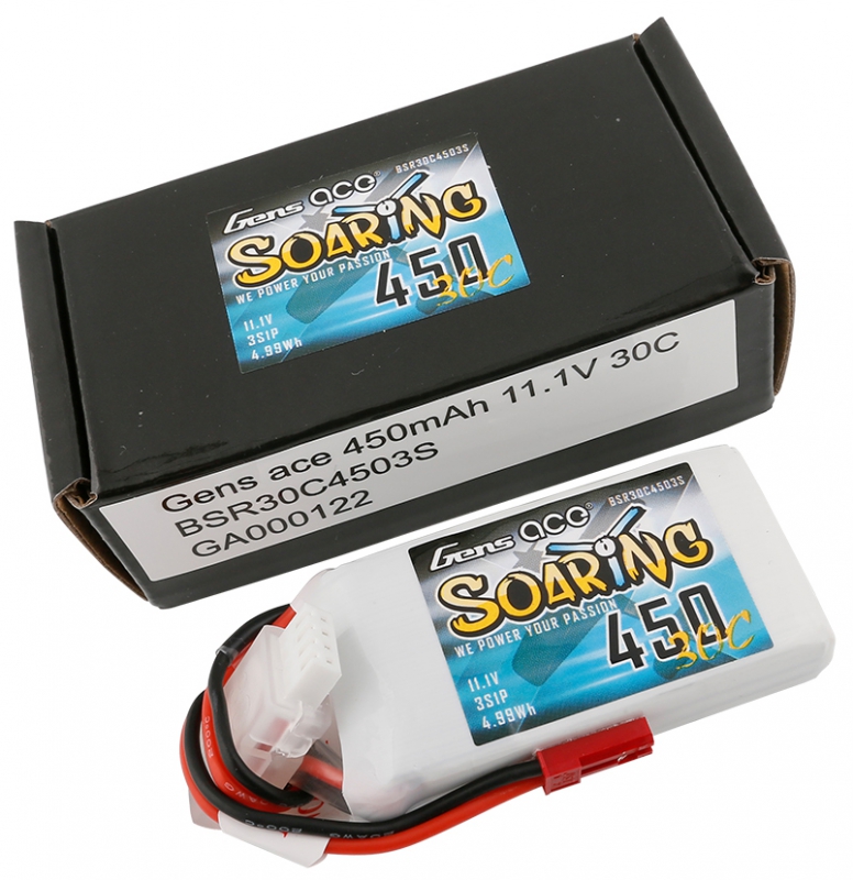 Gens ace soaring lipo 450mah 3S1P 30C battery is suitable for the following models: small indoor 3D, aerobatic, sport, or scale airplanes using Park 300 and Park 370 motors on 3S applications.