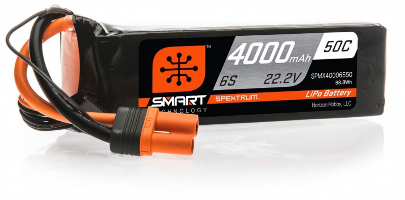 - Product Type: Spektrum O-SPMX40006S50 Smart LiPo battery 6S 4000mAh 50C with IC5 connector and microchip, Spektrum O-SPMX40006S50 22.2V Smart battery with auto discharge and data logging features, Spektrum O-SPMX40006S50 6-cell LiPo with 12 AWG wire and JST/XH balance connector, Spektrum O-SPMX40006S50 with soft case, 3C max charge rate, and 625g weight, Smart LiPo battery with IC5/EC5 compatibility and protective alloy sheet