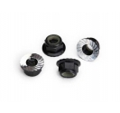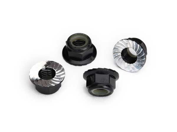 Lightweight and great looking, these 5 mm anodised aluminium flanged lock nuts are the perfect finishing touch for your vehicle. The serrated flange and nylon locking washer keep them snug on the wheel during even the most intense action. Sold as a set of four.