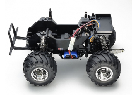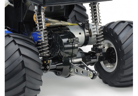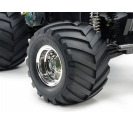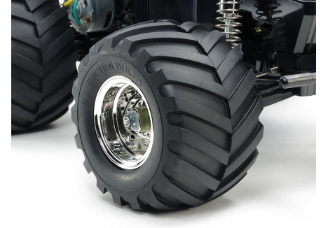 The Tamiya metallic monster truck with 115mm tyres and chrome wheels TAM58365 is engineered for performance and style. The oversized tyres allow the truck to roll over obstacles with ease, while the chrome wheels add a touch of custom flair. The suspension system, featuring front swing arms and rear rigid coil springs, absorbs shocks effectively, making it suitable for both flat and uneven surfaces. The sealed gearbox ensures long-term reliability, and the ball-adjusted steering rod provides precise control during tight maneuvers.