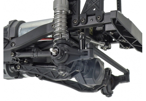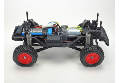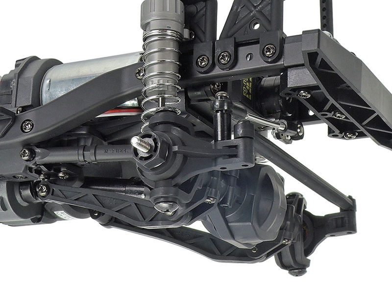 The CC-02 chassis is engineered for rugged terrain, with a ladder frame inspired by full-size off-road vehicles. Its separated gearbox and transfer case layout mimics real-world drivetrains, while propeller shafts transmit power to bevel-type differential gears at both ends. The four-link rigid suspension and oil dampers ensure stability and articulation on rocky trails, making this an ideal Tamiya Unimog brushed 540 motor 4WD truck.