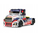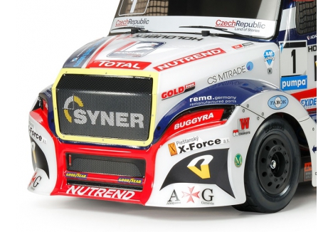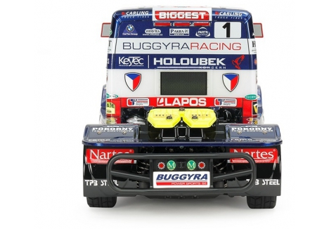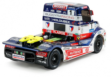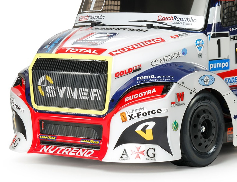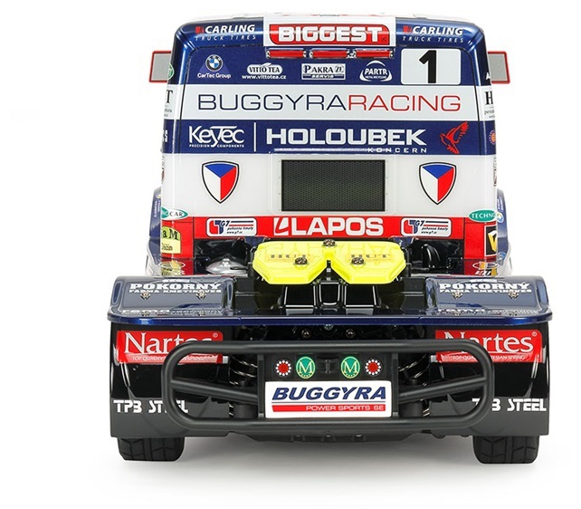 This model recreates the Buggyra Racing Fat Fox piloted in the 2018 season of the European truck racing circuit by 2017 champion Adam Lacko. The realistic body is a 3-piece set made from lightweight and durable polycarbonate, with separately molded plastic side mirrors, coupler and rear bumper parts. The TT-01 Type-E chassis is a proven performer, and this chassis is fitted with dedicated semi-truck wheels and tires for the model.