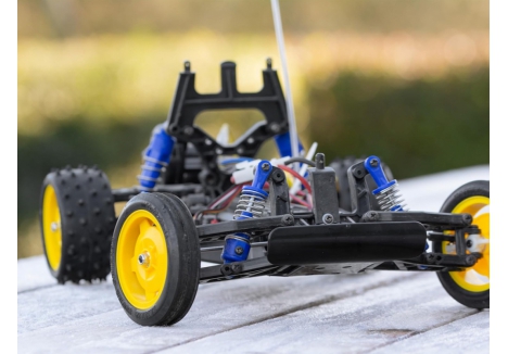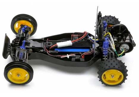 The Tamiya rear wheel drive buggy with coil spring suspension delivers responsive handling and reliable traction. Rear-wheel drive enhances maneuverability, especially on loose surfaces, while the coil spring dampers absorb shocks and maintain tire contact. The 3-bevel differential gear ensures smooth power distribution, reducing wheel spin and improving control. These features work together to provide a stable and enjoyable driving experience across a variety of off-road conditions.