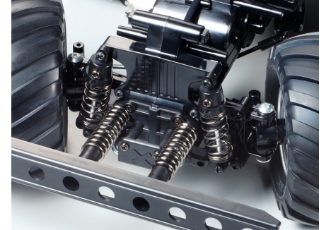 The Tamiya 6-wheel drive KongHead monster truck with friction dampers TAM58646 features a fully independent double wishbone suspension across all six wheels. This setup is paired with friction dampers that absorb shocks and maintain stability over uneven terrain. Whether you're navigating rocky paths or loose gravel, the suspension system ensures consistent contact and control. The 113mm diameter tyres provide additional cushioning and grip, while the chrome-plated wheels add a layer of visual appeal. Together, these components make the Tamiya KongHead off-road truck with chrome wheels and double wishbone suspension a reliable performer in demanding conditions.