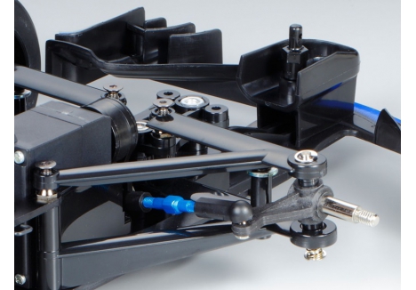 The 1.5mm thick FRP T-bar design with U-shaped cutaway is inherited from the F104WGP. It makes up the rear suspension in concert with friction plates and a TRF damper.
