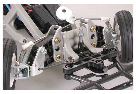 The 2WD racing buggy with front double wishbone suspension and rear trailing arm with aluminum oil dampers features a fully independent 4-wheel suspension setup. At the front, double wishbone arms with in-board springs and steel radius rods offer precise steering and shock absorption. The rear trailing arm configuration incorporates horizontally mounted aluminum diaphragm dampers, replacing the original oil units for improved response and durability. This combination allows each wheel to react independently to terrain changes, maintaining traction and stability during aggressive maneuvers and uneven landings.