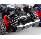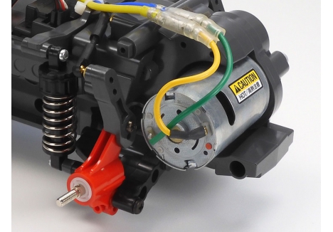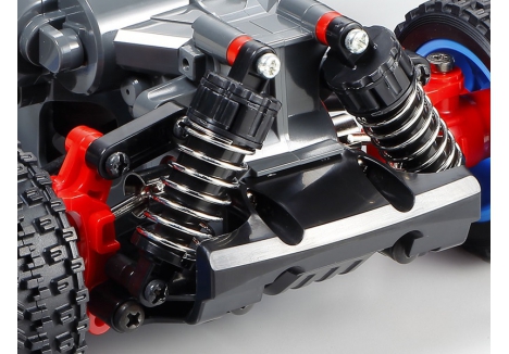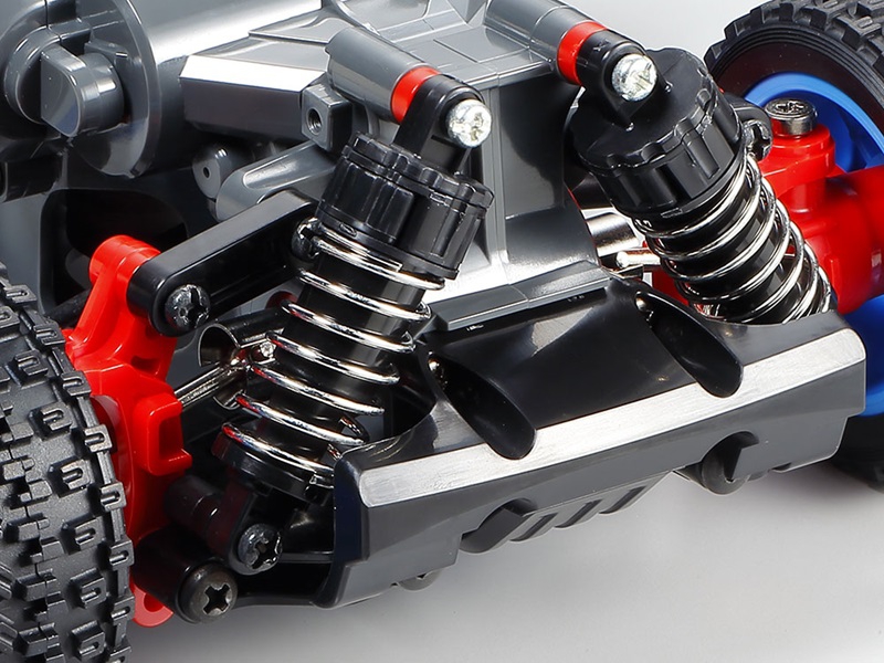 Based around a tough monocoque frame with integrated gearboxes, this compact 4WD chassis gives a thrilling drive whether you take it on road or flat dirt surfaces. It features a rear-mounted motor, with gear-driven rear wheels and a propeller shaft taking power to the front. Both front and rear gearboxes have differential gears. The battery pack location in the chassis center secures excellent balance, while 4-wheel independent double wishbone suspension employs friction dampers. Off-road capable M-05Ra chassis uprights and hub carriers, plus rally block tires are also included.