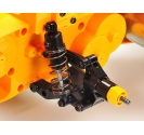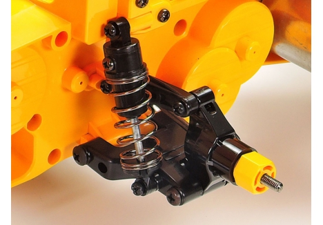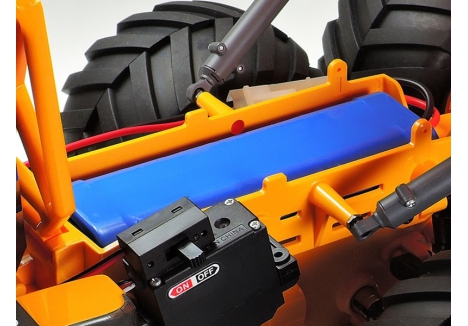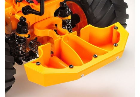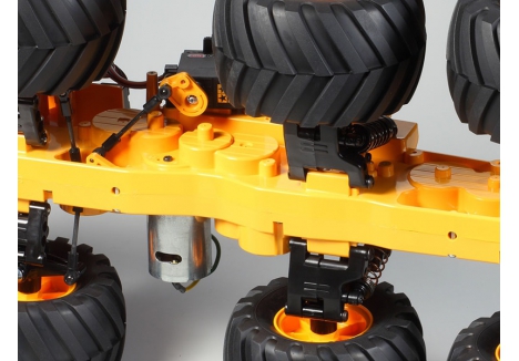 The fun G6-01 chassis is based around a tough, slimline monocoque frame and offers excellent off-road performance thanks to a 6-wheel drive system. Power is provided by a motor behind the front wheels, and transmitted to front, center and rear wheels via gears. The gearbox is sealed to protect from dust and debris and integrated into the frame; it has built-in front, center and rear differential gears to provide smooth cornering. 6-wheel double wishbone suspension is fitted with friction dampers. A 2-piece steering tie-rod setup utilizes the servo on the left for excellent response. With suspension reassembly and a separately-sold transmitter with 4WS function and R/C equipment, the rear wheels can be made steerable.