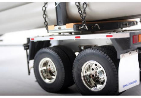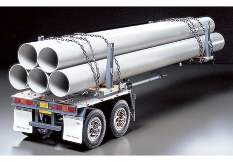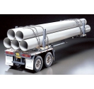 The Tamiya TAM56310 semi-trailer with chrome radial wheels, solid axle suspension, and friction dampers features collapsible aluminum pipe mounts that can be set to three different lengths. This adjustability allows users to tailor the trailer’s configuration to match the length of the cargo being hauled. Whether transporting the included 75 cm plastic pipes or other scale items, the mount system ensures secure placement and realistic presentation. The collapsible design also makes the trailer suitable for varied display setups, from compact shelf arrangements to extended hauling scenarios.