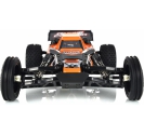 The stylish slim-line form of this chassis stems from its lightweight yet durable monocoque frame, which features a longitudinally-positioned battery and the R/C equipment along the centerline for excellent balance. The combination of a long 287mm wheelbase and 4-wheel double wishbone suspension married to CVA oil dampers with long arms, allows the model to handle with stability on poor surfaces. Ribbed front and square spike rear tires provide ample grip, and the rear-positioned gearbox is sealed to protect from dust and dirt, with the built-in differential gear offering smooth cornering.