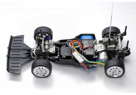 The Lancia body is specifically mounted on a TA-02 variant. Known as the TA-02S, this version exhibits a short-wheelbase to accommodate the scale form of the real sports car. It features a tub chassis with 4-wheel, fully independent suspension coupled with a rear ball differential and a front gear type differential.
