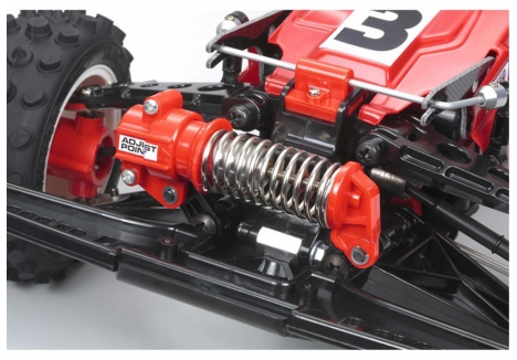 The Tamiya TAM58391 4-wheel double wishbone suspension system is engineered for control and durability. Stabilizers enhance cornering stability, while the adjustable mono-shock oil dampers absorb impacts across varied terrain. This setup allows the buggy to maintain traction and composure, even during aggressive driving. Combined with the shaft-driven drivetrain and enclosed gearboxes, the suspension system ensures consistent performance in off-road conditions and competitive environments.