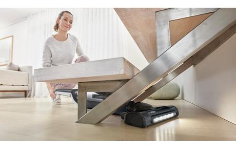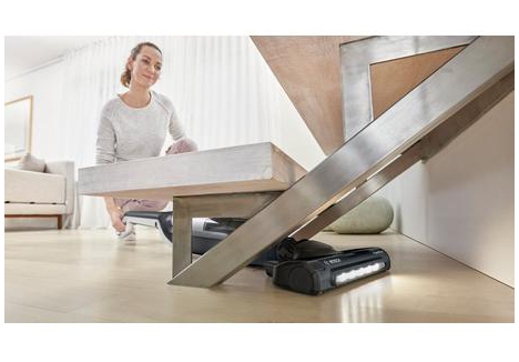 The integrated **Bosch Flexxo Serie 4 ProHome vacuum** features advanced lithium-ion battery technology, delivering long-lasting power and short recharge times. The vacuum operates with two performance levels, so you can adjust suction power as needed for different surfaces. It charges in 5 hours and offers fade-free cleaning up to 50 minutes.