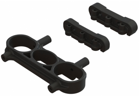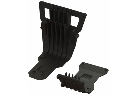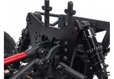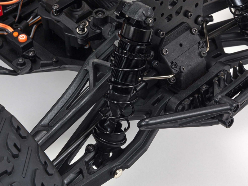 The wide-track suspension and extra-long wheelbase of the ARRMA C-ARA7618T1 4WD military-style truck provide dynamic handling across uneven surfaces. Adjustable aluminium-bodied oil-filled shocks are mounted on black-anodized shock towers, delivering plush damping and consistent tyre contact. The dBoots FIRETEAM tyres feature a vented airless-style design with military-inspired wheels, offering high traction and durability. Whether you're navigating rocky trails or launching off ramps, the suspension system ensures the ARRMA RC car with Smart ESC and dBoots FIRETEAM tyres remains composed and responsive.